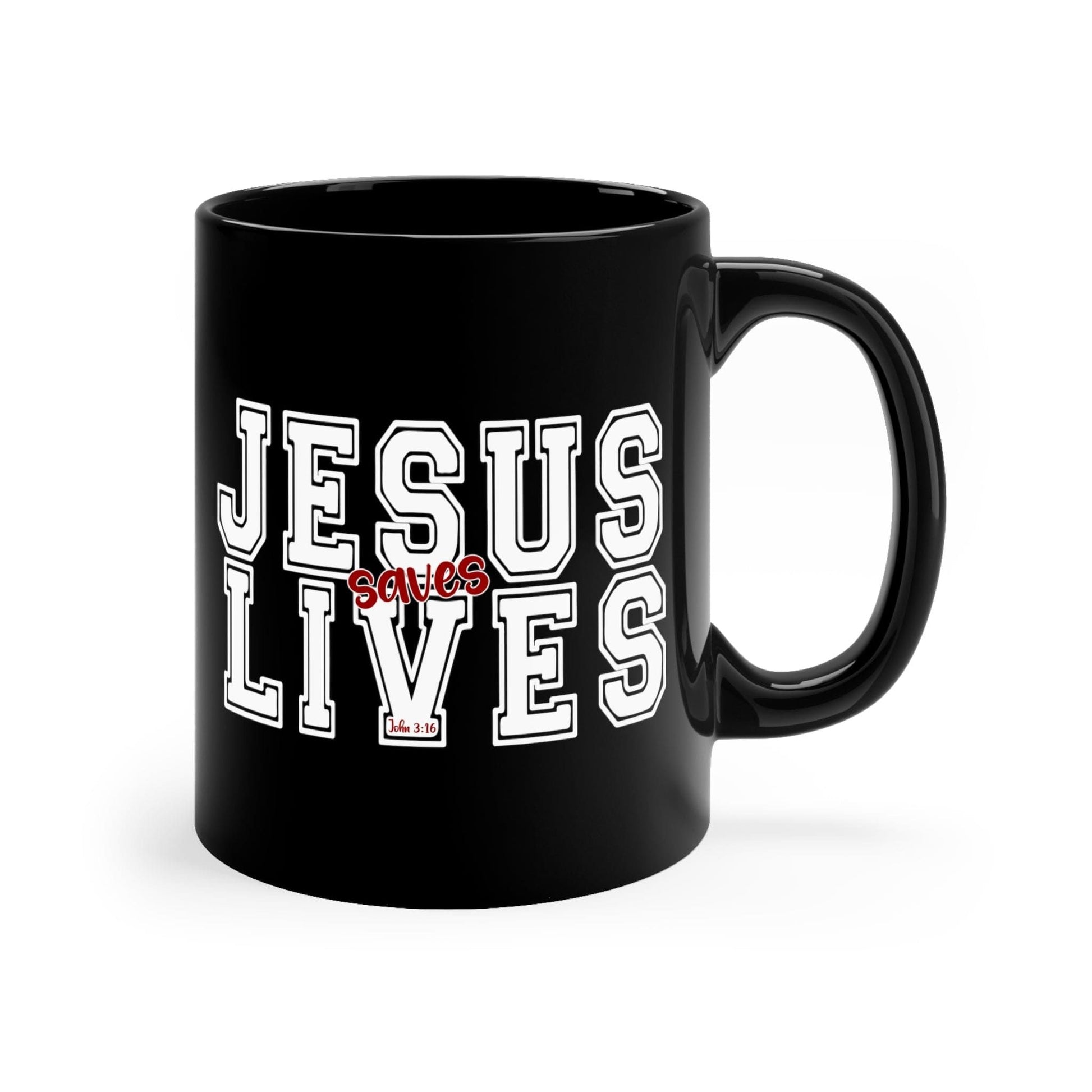 Black Ceramic Mug - 11oz, Jesus Saves Lives White Red Illustration