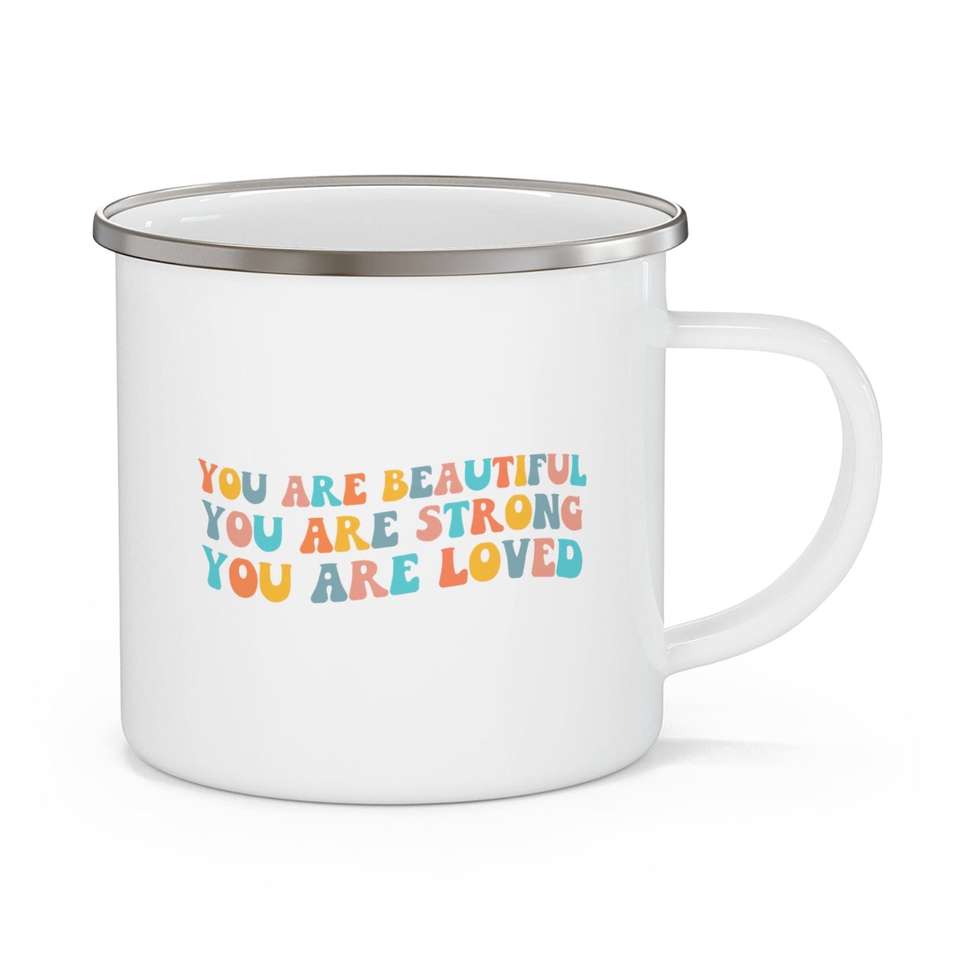 Enamel Camping Mug, You Are Beautiful Strong Loved Inspiration Affirmation Multicolor