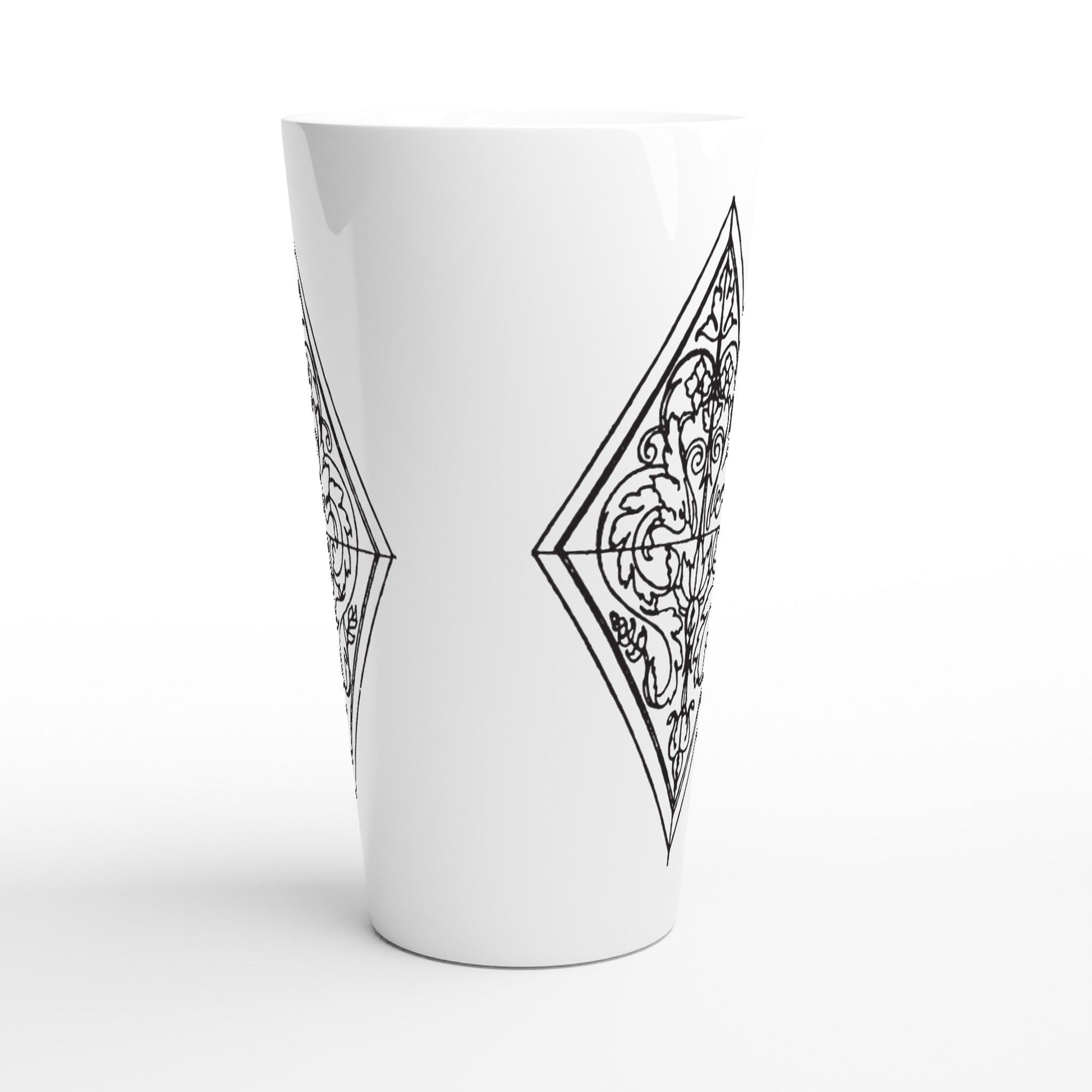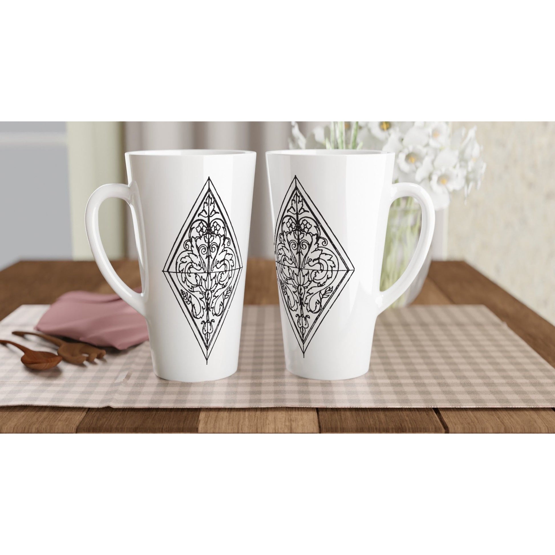 Embrace elegance with the Ornate Lozenge coffee Mugs. This 17oz latte ceramic coffee mugs features a captivating black and white lozenge design, expertly crafted by HadiArts. The intricate details and geometric patterns, inspired by vintage line drawings, add a touch of sophistication and artistry to your daily routine.