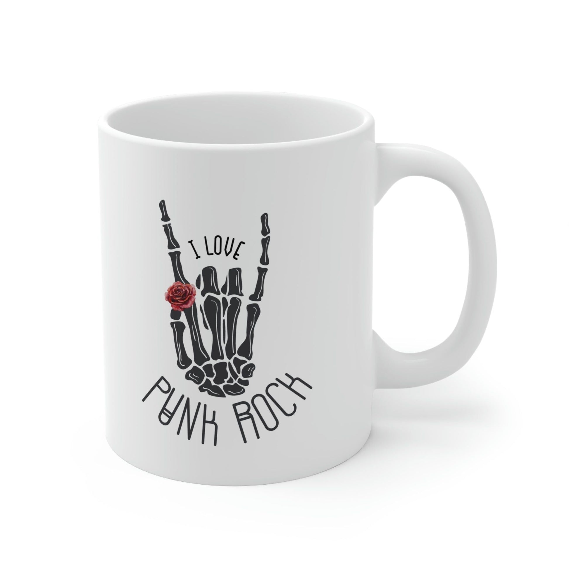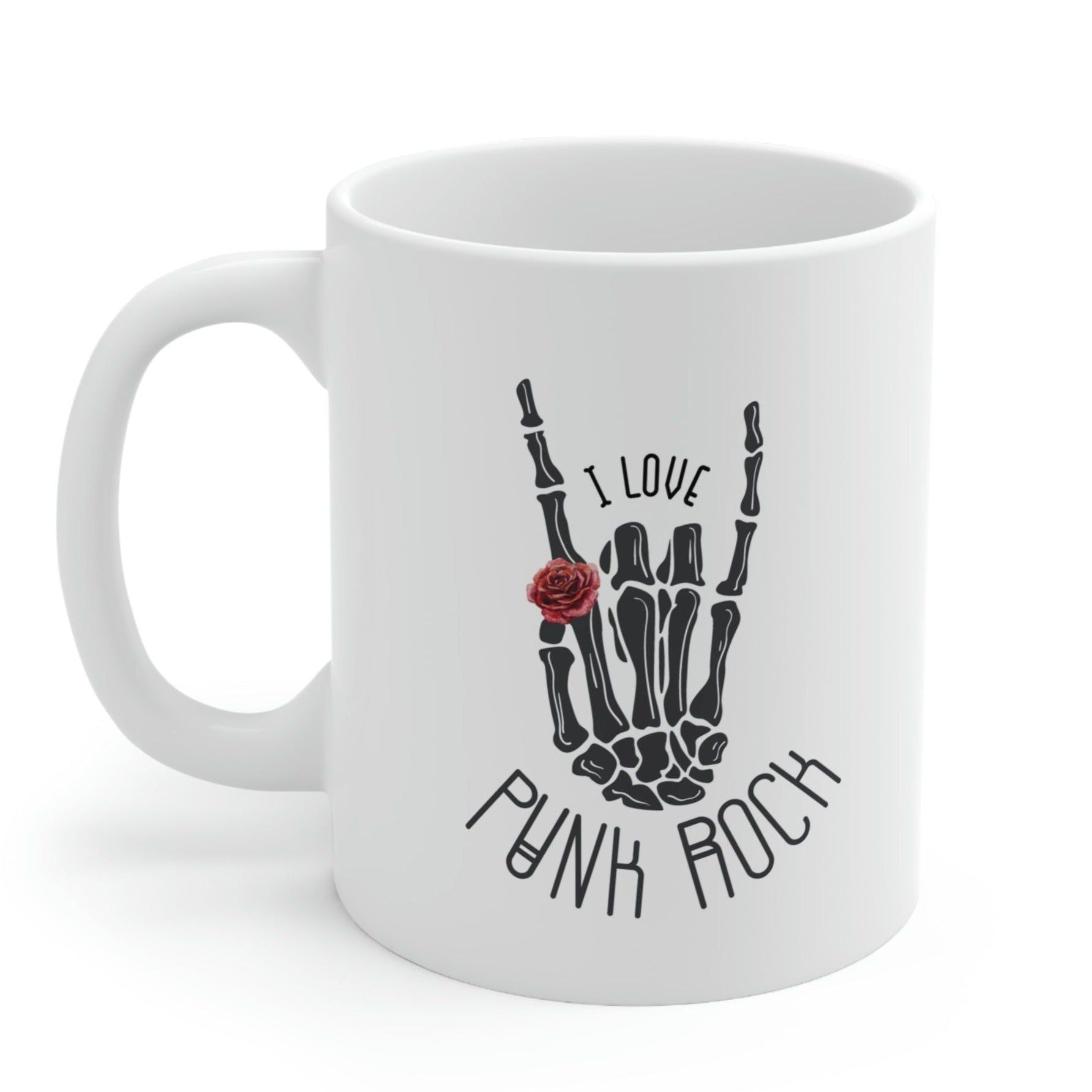 Unique I Love Punk Rock Skeleton Hand Mug. It's microwave & dishwasher-safe and made of white; durable ceramic in an 11-ounce size. The perfect gift for the coffee; tea; and chocolate lovers.